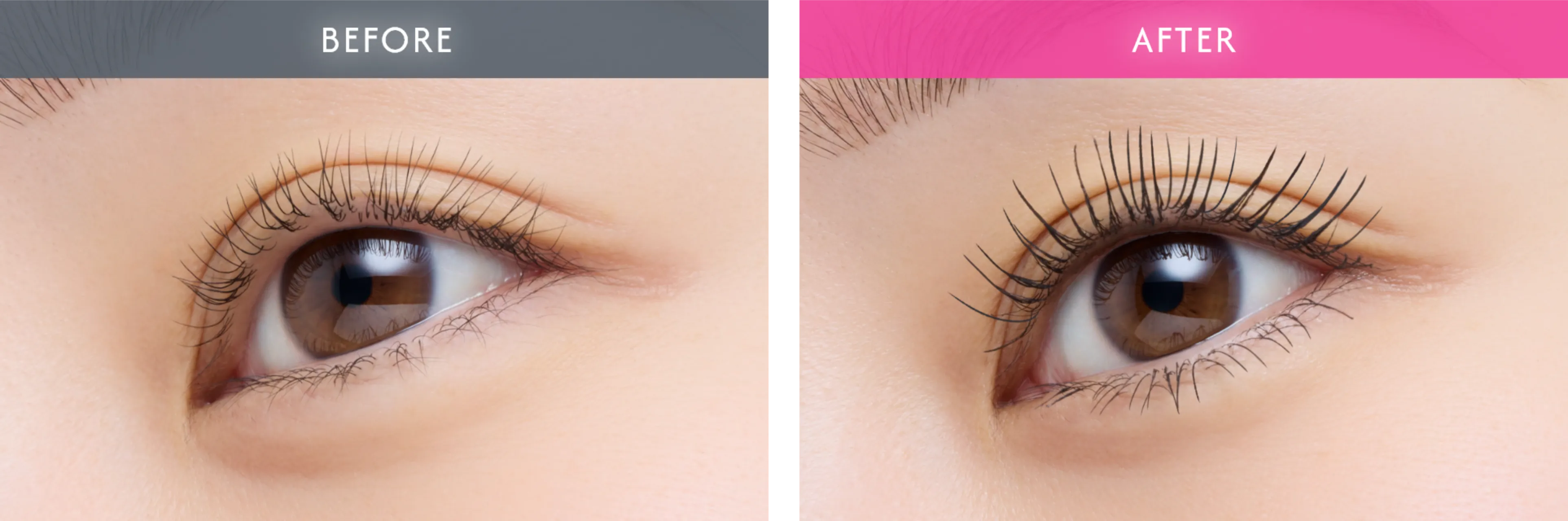 Once the mascara formula dries, it transforms into a glossy coating agent-like film, achieving an elegant, clump-free finish with defined volume.