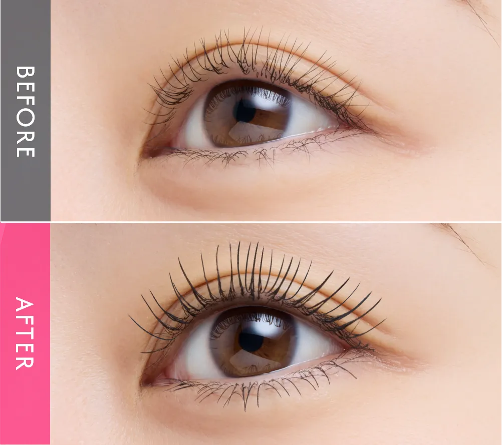 Once the mascara formula dries, it transforms into a glossy coating agent-like film, achieving an elegant, clump-free finish with defined volume.